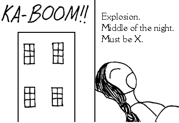 - From a Certain Point of View: Jenny's first letter home after getting to college describe's X's habit of blowing stuff up on a regular basis as "Moving in has been a blast."