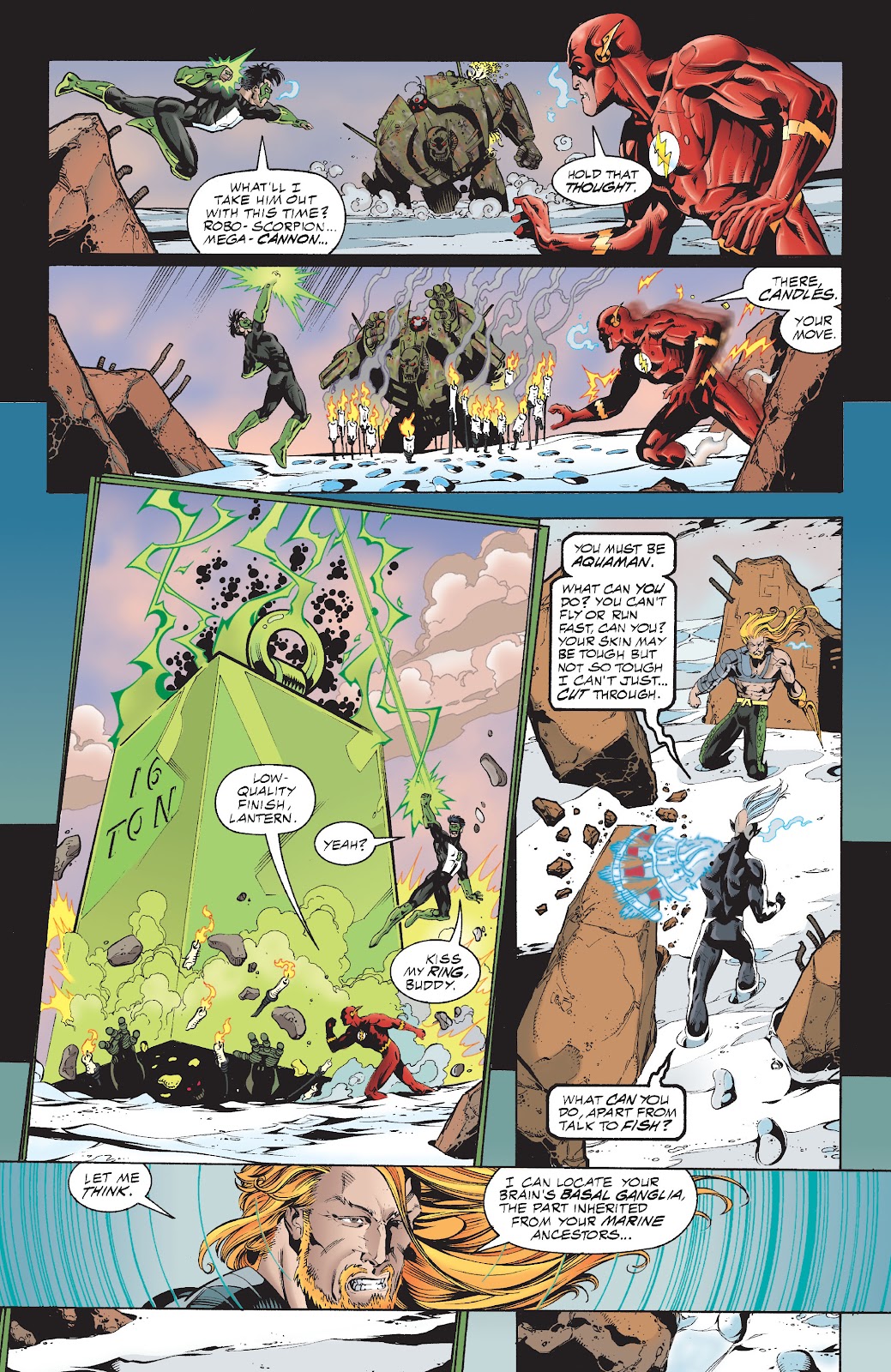 - He gets a really great moment like this in "JLA: Midsummer's Nightmare". Arbitrarily powerful badguy Knowman has just punched Superman into orbit. He makes a crack along the lines of "You people have no idea the kind of pressure I've been under. Allow me to demonstrate," and increases gravity enough to knock the entire team, including Martian Manhunter and Wonder Woman, to the floor, where they stay as he strides around monologuing. Until he makes the mistake of walking by Aquaman, who mutters "Pressure? Obviously you've never been to the bottom of the sea!" before ganking him with his hook hand and yanking him to the floor.