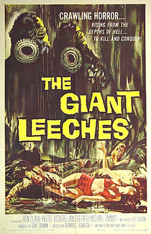 Attack of the Giant Leeches is a "typical for its day" 1959 monster movie co-produced by Roger Corman, about... well, an attack by some giant leeches. It is mostly notable for its appearance in a fourth season episode of Mystery Science Theater 3000, alongside the first episode of Film Serial Undersea Kingdom.