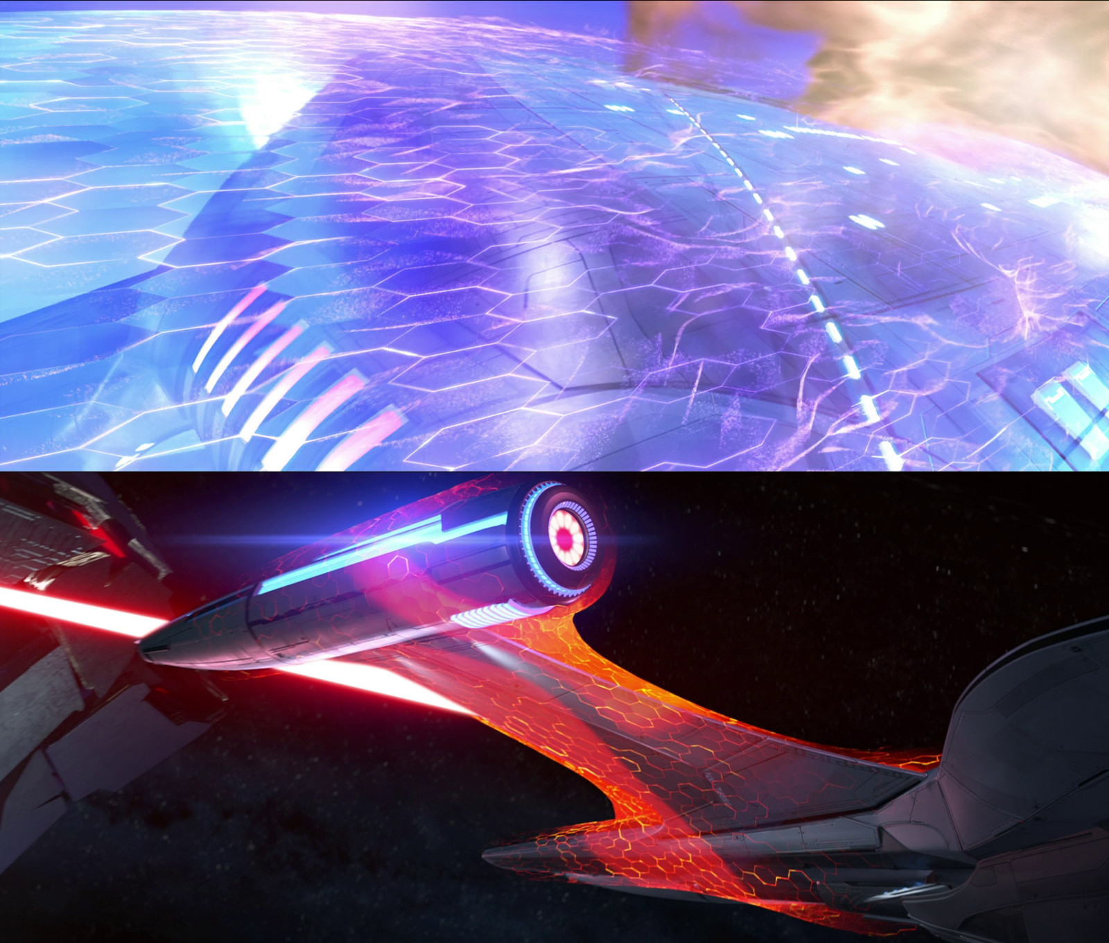 - Star Trek typically avoided this trope with energy shielding and forcefields resembling particulate, electricity or static, however Paramount/Nickelodeon new series Star Trek: Prodigy brings this design to the table. The hero Ship, USS Protostar is equipped with deflector shields, exhibiting network of orange-red hexagonal tiles up close. From distance the shield appears as a hexagonal web which projects about a meter from the hull.