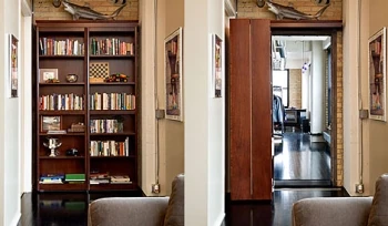- The International Spy Museum has one which is a dark twist on the trope. It was in the office of a KGB official and lead to a Torture Cellar where interviewees would be taken following casual conversation in the office.