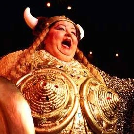 The trope name is a reference to the Icelandic queen Brunhild in the German epic Das Nibelungenlied, who could possibly be the inspiration for such characters. In the story she challenges men who attempt to wed her into warlike games, throws boulders with ease, and even ties her own husband up and hangs him on the wall. These traits, combined with the large women who usually play her in operatic adaptations, have led people to commonly assume she's an unattractive, mannish woman, even though the story actually describes her as very attractive. "It ain't over 'til the fat lady sings" is likely a reference to Brünnhilde's famous (and memetically glass shattering) immolation scene in Richard Wagner's Götterdämmerung. Big women (like Frieda Leider, Birgit Nilsson, and Jessye Norman) play her in the operas because they're usually the only ones with the vocal vigor to take on Brünnhilde's role.