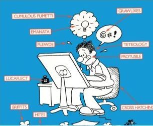Mort Walker of Beetle Bailey and Hi and Lois fame is also credited with creating a bunch of nonsense words for the shorthand symbols used in Newspaper Comics. In 1980 he released a book called The Lexicon of Comicana that listed and defined all of these terms. Many of the terms were adopted by other cartoonists, and even incorporated into cartooning how-to books, although those of us outside the industry (or just preferring to not sound crazy) will usually still use expressions like "dust clouds" and "motion lines".