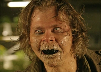 Before he leaves, though, the Doctor notices a pair of people are missing, and wonders where they are[1]. , one of the missing (Andy) is already dead and the other (Maggie) is found already conked on the head. She's taken off to the medical dome while Adelaide drags the Doctor off into where Andy was last seen: the Bio Sphere, joined by Expendable Crewman Tarak. Within a good few minutes, Tarak is separated from the Doctor and finds what appears to be Andy... water flowing off of Andy like he's a theme park ride. Andy's face is then seen - a cracked parody of the human face also eternally drooling massive amounts of water.