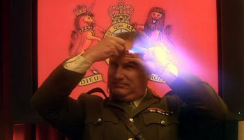The British government is in full crisis mode, here defined as "a bunch of people running around, not sure what to do". Harriet Jones (MP, Flydale North) displays a crackerjack sense of timing as she decides that the middle of an alien invasion is the perfect time to advance her pet project (hospital standards of excellence, in case you're wondering). Everyone fends her off, on the grounds that there's an alien invasion on, so she sneaks into the Secret Meeting Room and puts her project briefing folder inside the official alien invasion briefcase. Approaching footsteps warn her to hide in a convenient closet, so she's the first to discover that the acting heads of the British government have been taken over by aliens! Dun duh DUUUUN!
