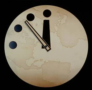The Doomsday Clock is a symbolic clock face maintained by the Bulletin of the Atomic Scientists at the University of Chicago. When it was originally introduced in 1947 the clock symbolized how close the world was to nuclear war, with the metaphor supporting it being: talks have broken down, and once midnight hits, the attacks start. And we are all doomed. But since the fall of the Iron Curtain, the original metaphor is (mostly) obsolete, and it has expanded to catastrophic destruction of any sort, provided it's on a global scale; the Bulletin's website specifically mentions Global Warming and bioengineering as possible causes in addition to nuclear war. Since 2024, Artificial Intelligence has also been a major concern. The Doomsday Clock is a very real and very eerie example of When the Clock Strikes Twelve and as such, it has received nods by several works.