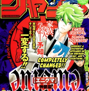 Enigme is a Manga series that ran in Shonen Jump and was written by Sakaki Kenji, who studied under Akira Amano (the author of Katekyo Hitman Reborn). Haiba Sumio is a student at a Tokyo High School with an interesting ability. He occasionally falls asleep and wakes up with premonitions of the future written out on his "Dream Diary". With this ability, Sumio helps out people in trouble before anything bad happens, until one day when his peaceful life completely changes. His mother is kidnapped and he and his friend Shigeru end up trapped in a game known as the "e-test" along with five other people who also posess special powers. Winning the game will allow him to save his mother, but as he progress through the test, the mysteries grow deeper...