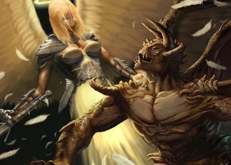 - Subverted in Infernum where angels can be genderless or of either gender, while all demons except Malcubi are genderless. Also, there is no artwork of female angels in any of the rulebooks, and many female demons (some of which are Fan Disservice — such as one 'she-demon' that is basically a four-breasted wolf-woman with tentacles instead of legs).