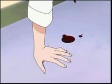 The Hero and the Villain face off in battle. They both pull their weapons and charge at each other. After the first blow we see a shot of the floor beneath one of the combatants. A stream of blood trickles down. This is a common way to show that the battle is serious and one of the characters is injured. Often the next shot will be of the injured party touching their wound and saying "I'm bleeding?" A common trope in any show that involves a lot of bleeding.