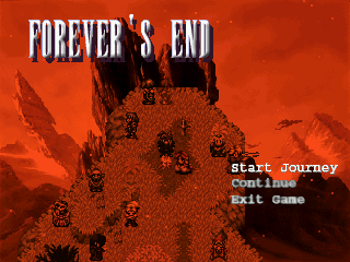 In development since 2008, NicoB's freeware RPG Forever's End at first appears to be nothing more than a standard Eastern RPG. Most of the story revolves around the power-hungry King Richard, his sinister advisor Marcellus, and the the blue-haired protagonist Epoch. After resigning from his position as Captain of the Dragon Knights and being labeled a traitor by his countrymen, Epoch must find a way to stop King Richard from collecting the six legendary crystals and ruling the world.