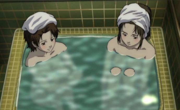 It is also done in the nude, which is where fanservice comes in. A Furo Scene, like a Hot Springs Episode, is an excuse to show the female members of the cast sans clothing. Also an easy excuse for the Skinship Grope and Naked People Are Funny, or maybe just some Bathtub Bonding.