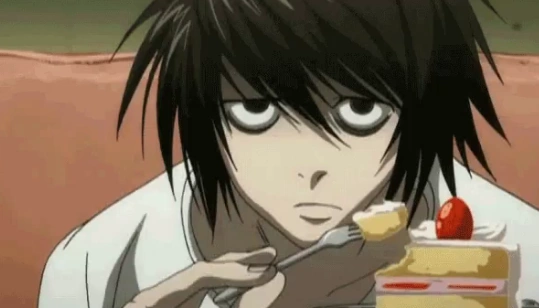 - L (pictured above) and Mello from Death Note both ate sweets constantly. (In Mello's case, he was always ominously biting into some chocolate.)