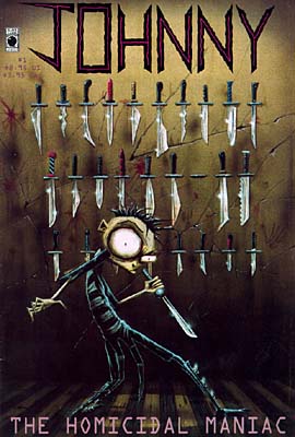 A series of comic books by Jhonen Vasquez, the guy who did Invader Zim. The titular Johnny (Nny for short) is a serial killer with various psychological disorders who does bizarre and often nasty things to bizarre and often nasty people. He often has long, serious, intellectual monologues about the state of society, only to end them with non-sequiturs like "Tuesday is UFO day". When not doing that, Nny likes to draw a comic strip about a deranged, foul-mouthed stick figure named "Happy Noodle Boy". His only friends (if you can call them that) are Todd "Squee" Casil, the meek kid next door whom he unintentionally scares shitless, and Nailbunny, a dead rabbit nailed to the wall who is actually Nny's voice of reason.