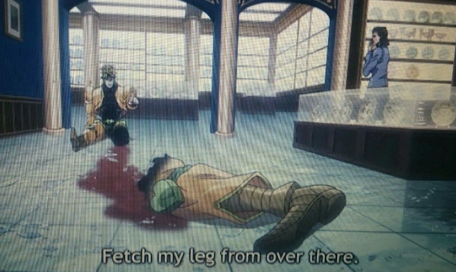 - Happens freqently in JoJo's Bizarre Adventure. Pictured above is a scene from Stardust Crusaders aka Part 3, where DIO tells a lady near him to hand him his recently ripped-off leg to he can reattach it.