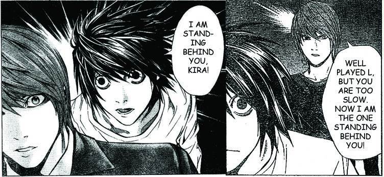 Alice suddenly appears facing Bob, and is ready to attack him. When he notices, she says "I am behind you!" Bob performs a Flash Step, reversing their relative positions. "No, I Am Behind You."