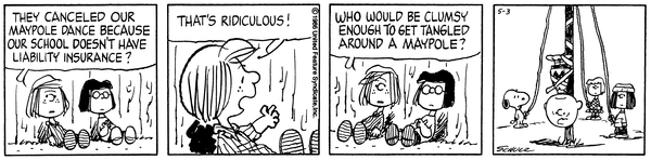 - 1986: Peppermint Patty is chosen as her school's May Queen, only to discover that there won't be a maypole dance because the school has no liability insurance. She fumes: "Who would be clumsy enough to get tangled around a maypole?" Who indeed...
