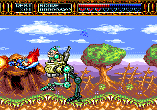 Rocket Knight Adventures is a side-scrolling action platform game series by Konami with diverse and distinctive gameplay mechanics such as short-range jetting in eight directions (including ricocheting off walls and around corners), charged attacks, swordplay, the occasional bit of shmup-style sustained flight, and much much more. The original game, on the Sega Mega Drive/Genesis, spawned two more games: Sparkster: Rocket Knight Adventures 2, a sequel also on the Mega Drive, and Sparkster, a game on the SNES which takes place in an alternate continuity. The series may owe its existence to the Sonic series, which put Funny Animal mascots in vogue and likely influenced the series's art style.