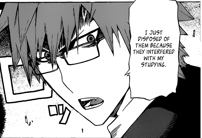 - Badass Bookworm: Do not interrupt Manabizaki when he's reading a book, or he'll kick your ass.