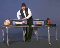 Almost as famous as the Pull a Rabbit Out of My Hat trick, this death-defying Stage Magician trick involves a pretty woman (the magician's assistant) being placed into a coffin-sized lidded wooden box, with a neck-hole in the top and ankle-holes in the bottom. Then, producing a large floppy hand-saw, the magician proceeds to saw through the box, through the woman's midsection, and through the table on which the box is resting. After that, the magician shoves in a pair of bizarre rectangular blades (sometimes called dividers) through the middle.