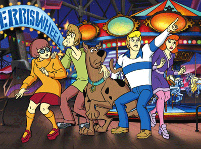 A popular Saturday Morning Cartoon from Hanna-Barbera that premiered in 1969 and lasted in various forms up to the early Eighties (and episodes are again being made today) featuring four teenagers (Fred Jones, Velma Dinkley, Daphne Blake and Norville "Shaggy" Rogers) and their talking dog Scooby Doo (a classic Speech-Impaired Animal) in a van called the Mystery Machine. Each episode they'd encounter a mystery involving some form of spooky supernatural monster which would more often than not turn out to be a hoax meant to frighten the locals away from the villain's real operation, and which would be resolved at the end by unmasking the villain, who would inevitably utter "I would have gotten away with it if it hadn't been for You Meddling Kids, and that dog too." Reportedly also full of drug references (hey, it was The Seventies), depending on how you read it (what the hell do they put in those Scooby Snacks, anyways?).