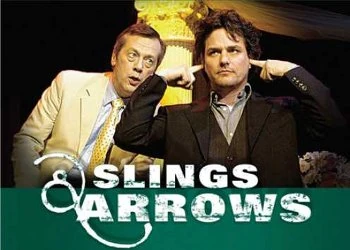 Slings and Arrows is a Canadian dark comedy about the New Burbage Festival, a thinly-veiled Fictional Counterpart of the Stratford Festival of Canada. It focuses on Geoffrey Tennant's return to the festival as artistic director upon the death of his estranged mentor, Oliver Welles (who immediately returns as a ghost visible only to Geoffrey). Each season is a Story Arc, focusing on Geoffrey's production of a great Shakespearean tragedy: the first season does Hamlet, the second Macbeth with a subplot about Romeo and Juliet, and the third King Lear.