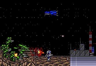 An Opening Scroll (briefly) establishes the background: Earth's outcasts have returned with a vengeance and attacked the planet in a vicious assault. The Earth Defense League tries its best to hold, but later levels reveal that Earth has been at least partially overrun. The end of the intro and the beginning of the game focus on Ganymede, one of Jupiter's moons.