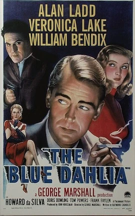 The Blue Dahlia is a 1946 Film Noir directed by George Marshall and written by Raymond Chandler. A navy officer returns home to an unfaithful wife, who is later murdered. It stars Alan Ladd as the navy officer, Johnny Morrison, and Veronica Lake as his Love Interest, the wife of a Mobster who is seeing Morrison's unfaithful wife, Helen (Doris Dowling). During the movie Johnny tries to solve the mystery of the murder of his wife while the police is looking for him as prime suspect.