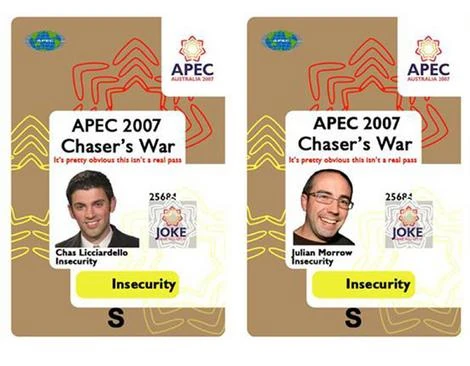 The Chaser's stunts have gotten them into trouble a few times, culminating in an incident during the APEC (Asia-Pacific Economic Cooperation) being held in Sydney in 2007: despite their expectations that the stunt would go no further than the outer boundary, their fake motorcade entered the Red Security Zone (the highest level security zone), despite having 'FAKE' and 'This is obviously a joke' stamped on their "passes", and with a. Chas, Julian, and a number of the crew for the show got arrested. It was this prank alone that started international buzz and later a bidding war for American syndication, eventually won by G 4 in late 2008.