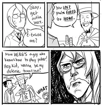 - Pictured: Kristoph Gavin became VERY angry when he found that Phoenix Wright had been chosen over him to represent a defendant. From Kristoph's point-of-view, it looked like said client had chosen Phoenix over himself because Phoenix had beat the client at poker and he hadn't. In actuality, the client wasn't paying attention to the results so much as how they played the game; he saw a ruthless streak in Kristoph's play that he deemed dangerous. He was right; Kristoph personally killed that defendant and had Wright disbarred.