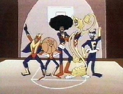The Super Globetrotters is a 1979 spinoff of The Harlem Globetrotters, produced by Hanna-Barbera for NBC. It ran for 13 episodes. It's five semi-real-life basketball entertainers who gain super powers. Ludicrous super powers. Nate Branch turns into water, Curly Neal retracts his limbs into his body and becomes a basketball, Twiggy Sanders can use his body as a rope, Sweet Lou Dunbar stores gadgets in his immense afro, and Geese Ausbie can duplicate himself. They fight villains, mostly by challenging them to basketball games.