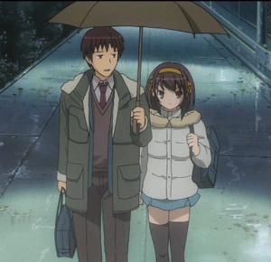 - In Suzumiya Haruhi, Haruhi walks Kyon home with the school umbrella. They aren't a couple, really.