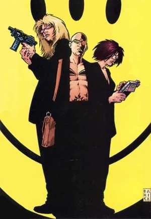 Transmetropolitan is a Cyberpunk Graphic Novel series by Warren Ellis and Darick Robertson, originally published from 1997 to 2002. It's a wild mix of gonzo journalism, American politics and the weird future. Although much of its focus is on surreal comedy, the books ultimately tell a heartwrenching story of one nation's politics swirling the drain in every possible way.