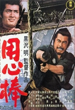 Yojimbo — more correctly Yōjinbō, meaning "bodyguard" — is a 1961 Jidai Geki directed by Akira Kurosawa, loosely based on Dashiell Hammett's novel Red Harvest. It stars Toshiro Mifune as wandering rōnin Sanjūrō, who arrives in a town beset by criminals and decides to clean the place up (apparently for fun). His method is simple, yet clever: he reduces the number of gangsters in the town by getting the two rival factions to go to war, then mops up the remainder. An enormously influential film, it has had at least two direct remakes — Sergio Leone's A Fistful of Dollars, and Walter Hill's Last Man Standing — as well as homages in numerous other films and television shows. It was even used as the basis of an episode of the Pokémon anime.